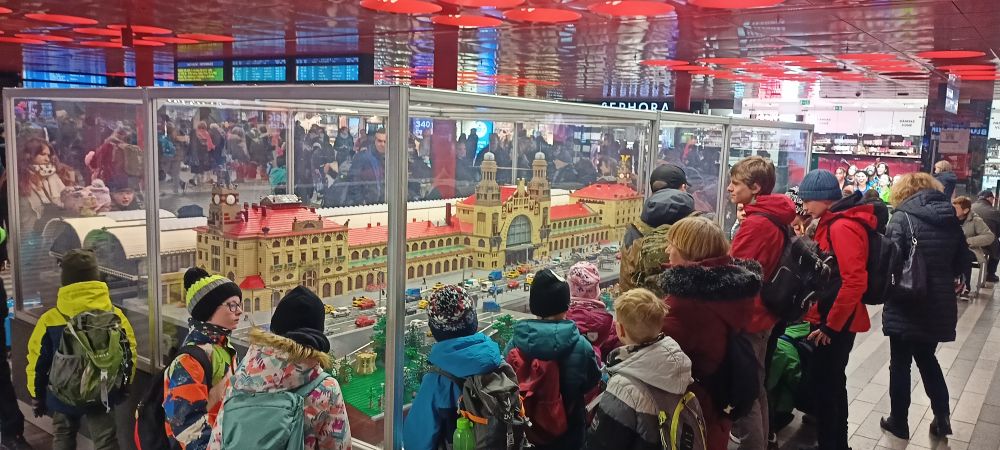 Studeného rána, v sobotu 22. 2. se na kolínském nádraží shromáždilo 28 malých Průzkumníčků se svými vedoucími, aby vyrazili na krátký výlet do Prahy. Jeli jsme rychlíkem, a tak jsme se již před 11. hodinou mohli obdivovat architektuře Wilsonova nádraží i jeho věrnému legovému modelu.