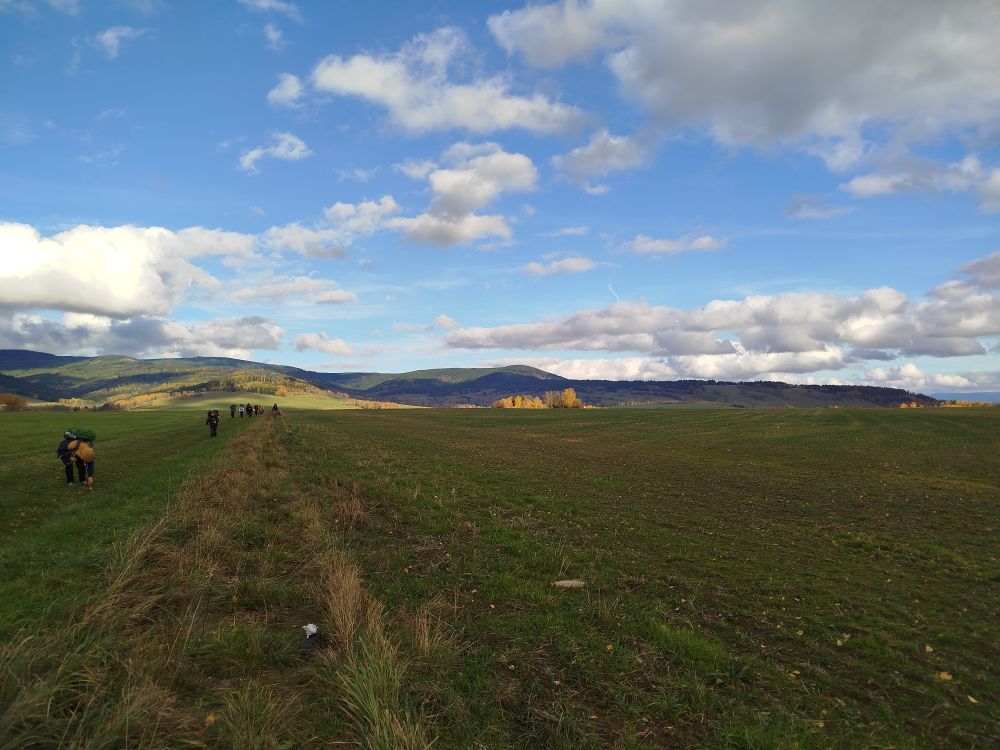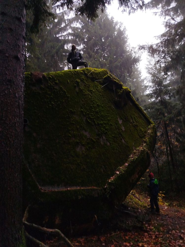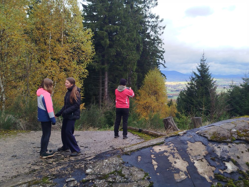 Venku jsme čapli batohy a vyrazili po červené značce jsme došli až na objekt, v jehož útrobách jsme se před chvílí nacházeli. Zde jsme dali pauzu a vytáhli oběd. Že to nebyla nejslavnější obědová lokace jsme brzy pocítili všichni do jednoho. Z důvodu výhodné pozice se objekt, na kterém jsme seděli, nacházel na vrcholu kopce, to znamená, že zde poměrně dosti foukalo. Proto byli všichni šťastní, když jsme opět vzali batohy a toto nehostinné místo opustili.