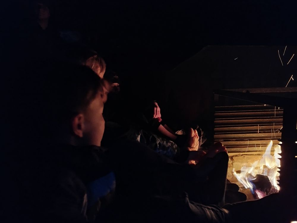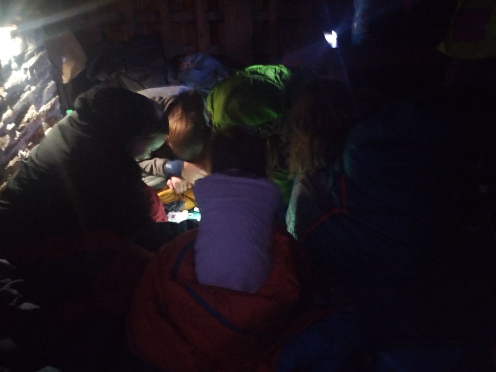 Zde jsme se uvelebili v altánu, který se zde nacházel a čerpali jsme teplo ze zde hořícího ohně. Na tom jsme si následně opekli večeři v podobě delikátních párkobuřtů. Netrvalo dlouho a každý už hledal místečko kde složí hlavu, někteří už se i vydali na kutě, jiní zorganizovali velkou lechtací hromadu a celý večer byl zakončen aktivitou, kdy pánská vedoucovská část určovala, k čemu slouží slečnami předváděné části jejich kosmetiky.