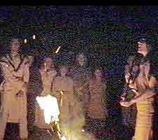 Léto roku 1996 bylo velice chladné. Snad i proto měl Ještěr značné problémy s rozděláváním ohně třením dřev. Po nějaké době to vzdal a pošeptal Lucii, že to nejde. Vedoucí se chvilku radili a pak Buggy prohlásil, že duch ohně je rušen a že se oheň bude muset rozdělat v klidu v teepee. To že okolo posvátného ohniště byl už delší dobu ruch, byla pravda, a tak toho Buggy využil. Zatím Ještěr v teepee chvíli třel dřeva o sebe a pak zapálil oheň třením sirky o škrtátko. Vynesl jej ven a zapálil připravenou hranici. Pak se snažila Ještěrka zapálit hořící větvičkou rudou dýmku nacpanou drtí z usušeného jahodového listí, jenže drť navlhla a dýmka jen párkrát začoudila, ale nechytla. Ještěrce nezbylo nic jiného, než s vyhaslou dýmkou provést rituál uctívání ducha rudé dýmky a pak dát dýmku ke kolování. Vzápětí dýmku Ještěr upustil a všichni vykřikli. To byl signál pro Starostu, který zapálil dýmovnici. Pak rozsvítil světlomety a na cestě k mostku se objevila temná postava. Zatím Kuba bojoval svoji soukromou bitvu. Zapnul první kazeťák, ale nic se neozvalo. Zastavil jej a zapnul druhý kazeťák se záložní nahrávkou. Ten naštěstí neselhal a duch promluvil.