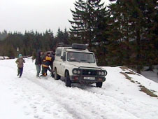 První várka se skládá do terénního auta, ale to tvrdošíjně stojí na místě a nechce startovat. Mráz mu nesvědčí. Takže všichni ven a tlačit.