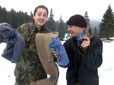 Potvrzuje se, že s orientací řidiče to není moc slavné. Už v pátek se Slon divil, že domorodec se musí dívat do mapy, aby věděl, kudy se na Kristiánov jede. Teď Zbyněk s sebou mapu nemá a orientuje se podle turistického značení. Na posledních křižovatkách před Novou Loukou ho musí Šéďa dokonce navigovat, jinak by asi skončili někde v Polsku. Dezorientovaný Zbyněk chvíli zmatkuje na Nové Louce, pak Průzkumníky vysazuje s tím, že by asi neprojel a že to musí dojít pěšky. Obrací a jede pro druhou partu. Naštěstí se počasí trochu uklidnilo, a tak večerní cesta lesem je docela příjemná. Před chatou se všichni špindírové musí povinně vyválet ve sněhu, což plní s radostí.