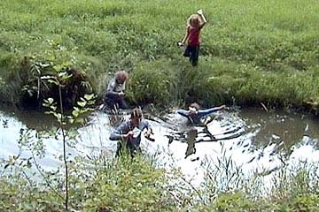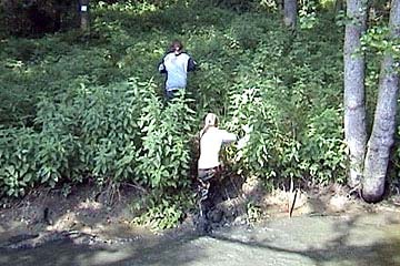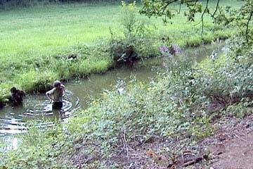 Přibíhá Bětka. Hledá vhodné místo k přebrodění a pak si začíná vyhrnovat
