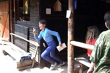 Kokos zaměřuje azimut, pak se vrací zpět do jídelny, rozbíhá se a skáče. Dopadá doprostřed potoka, ale to