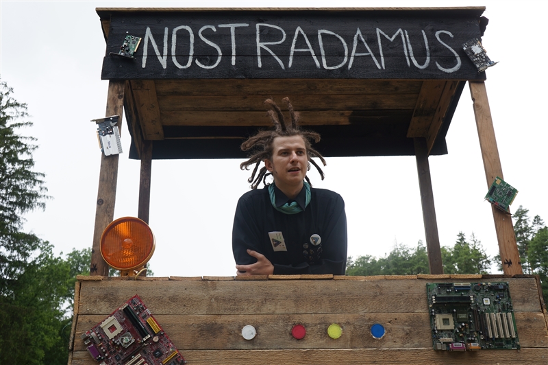 11. 7. 2114. Další den započal svižnou rozcvičkou následovanou bodováním kajut. Do toho mírně pršelo, ale náladu to nikomu nezhoršilo. Po dobré a vydatné snídani se vydali rekruti na první dopolední zaměstnání. Po dokončení práce následovala svačina a pak nástup na druhé vzdělávací dopoledne. Při obědě všem začalo docházet, že za pár chvil se budou psát testy ze specializací. Proto se většina rekrutů poctivě celý polední klid učila. Zápočtové testy dopadly relativně dobře, všichni je složili. Následoval nástup, na kterém nám Helmut řekl, co se bude dít. Plán byl následující: postavit cvičné rakety a po večeři odlet lodi Nostradamus. Stavba rekruty velmi bavila a i samotní vedoucí se s oblibou zapojili. Díky soukromému mecenáši měli rekruti po ruce spousty dobrých zlepšováků pro své rakety. Po dokončení stavby následovala ona večeře a po ní slavnostní odpalování raket. To se povedlo až na tři rakety, které z technických důvodů nevzlétly. Po odpálení poslední rakety nastal čas pro náš odlet. Všichni se sešli a se zatajeným dechem pozorovali kapitánský můstek. Začal odpočet, při němž se zažehly motory, po chvíli dostaly dostatečný tah a za pár chvil jsme již byli ve vesmíru. (Gregor Pavlov Ivanovič)