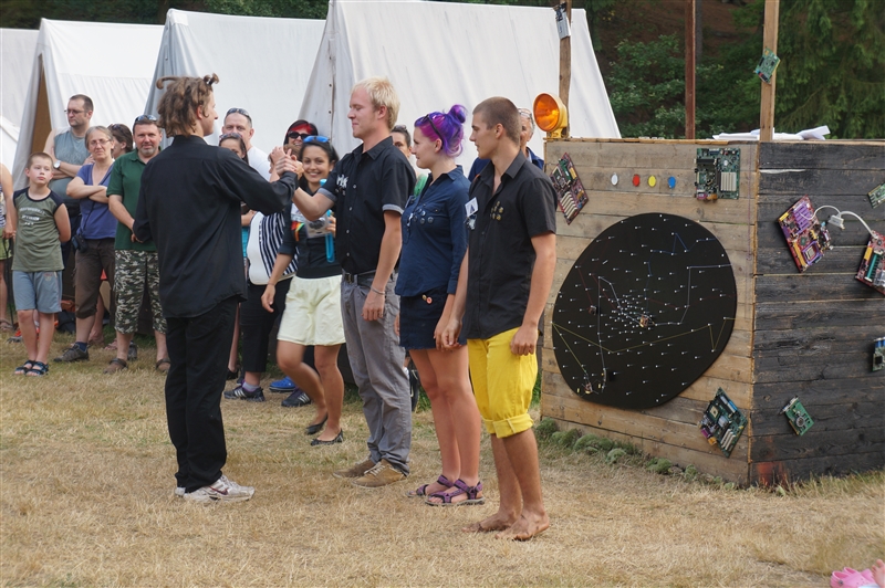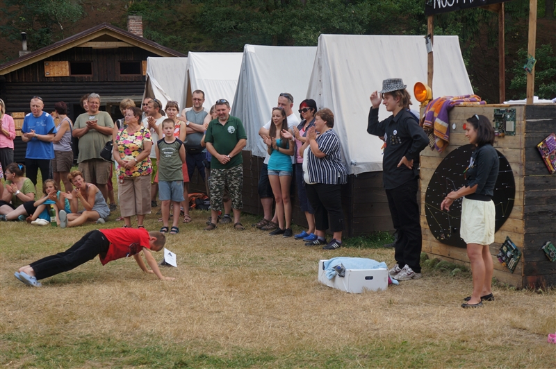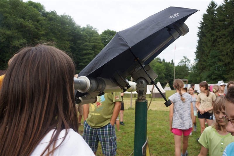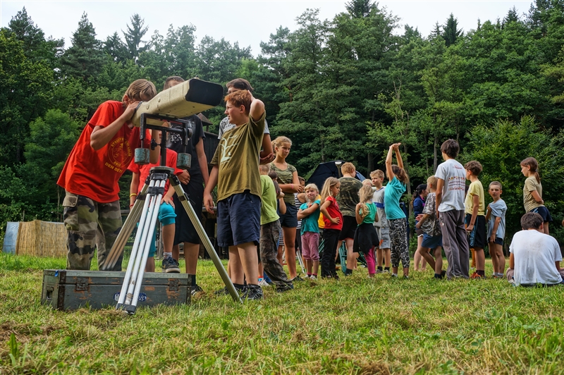 9. 7. 2114. Středa, den pátý. Středeční ráno jsme započali menší změnou. Tradiční budíček byl pozměněn na osmou hodinu ranní z důvodu návštěvy astronomů ze Štěfánikovy hvězdárny a jejich náročné přednášky, která se protáhla až do pozdních hodin. Po bodování, snídani a ranním nástupu nám bylo umožněno podívat se speciálním dalekohledem na slunce. Poté jsme se společně s rekruty rozešli na zaměstnání. Po svačině proběhl menší prodej suvenýrů s astronomickou tématikou. Po obědě jsme měli pro rekruty připravenou maskovací hru na policajty a zloděje. Po hře už jsme se zase všichni těšili na Jenckův buřtguláš, který se mu skutečně vydařil. Na závěr večera jsme se zas po dvou dnech společně sešli u ohně, kde jsme si zapěli nějaké ty písně. Počasí nám sice moc nepřálo, ale jemný deštík nás o večer u ohně nepřipravil, za pomocí pláštěnek se to zvládlo. (Sergej Lavrov)