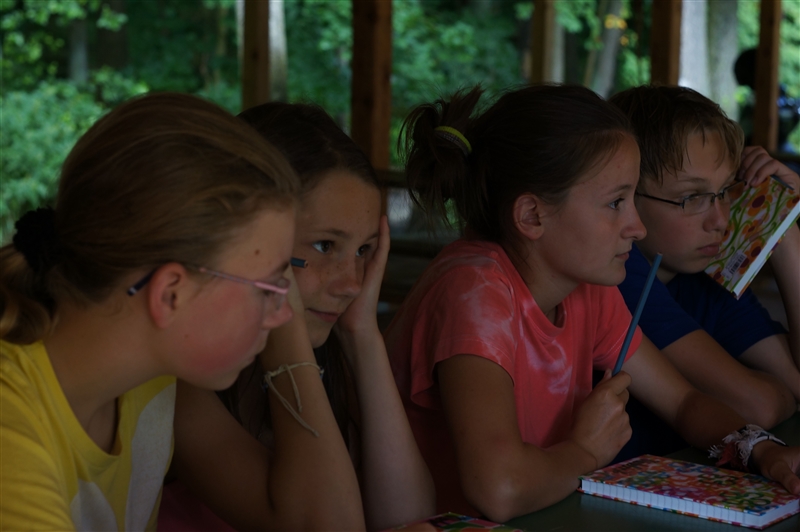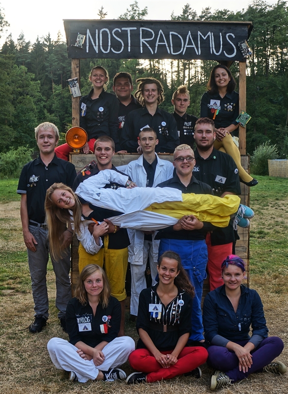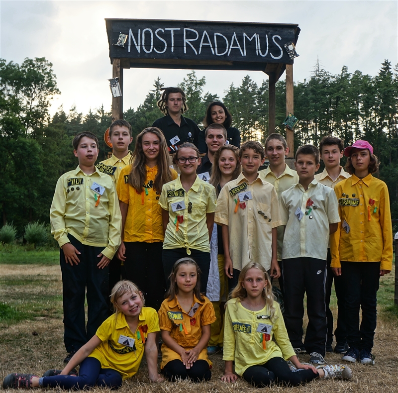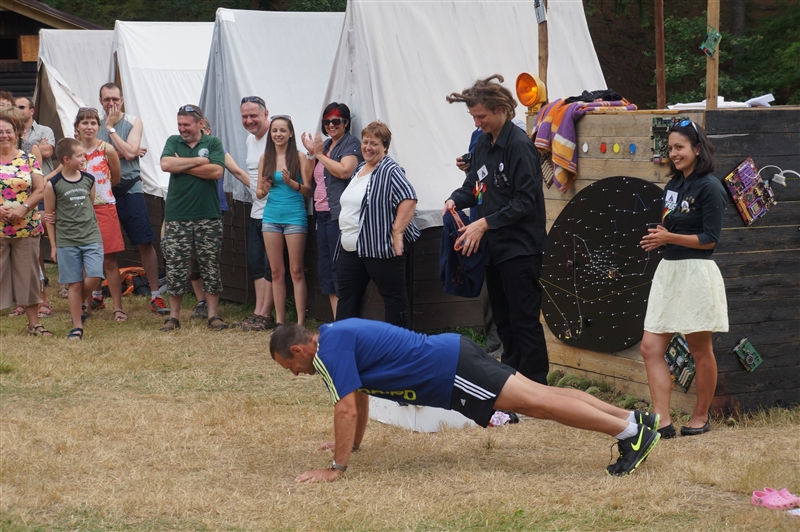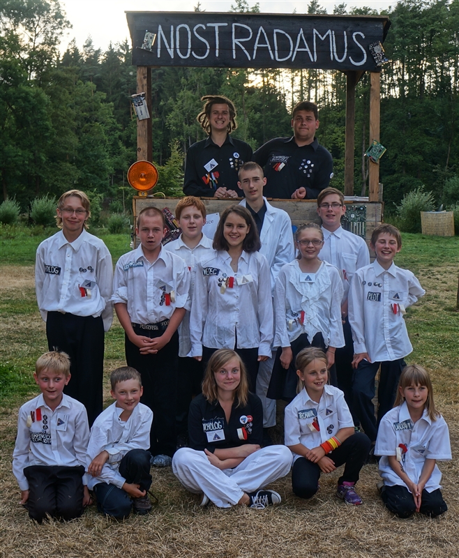 15. 7. 2114. Dnešní den započal tradičně rozcvičkou. Následovalo přísné bodování, ranní hygiena a dále snídaně. Dopoledne proběhlo v netradičním duchu, jelikož náš tábor přivítal každoročně známou návštěvu z krajské hygienické stanice. Vše bylo v pořádku, takže jsme po odjezdu mohli pokračovat v našem denním režimu. Nicméně, namísto 2. dopoledních zaměstnání jsme si nacvičovali program na návštěvní den. Následoval oběd, výborná fazolová polévka a dále brambory s rybím filé a okurkovým salátem. Po nočním přistání na planetě Hulu-Bulu byl náš vrchní navigátor napaden místními primitivními domorodci a následně dnes, při poledním klidu, se u všech vedoucích začaly projevovat známky posedlosti po zdejším minerálním bohatství, což mělo za následek opravdový zmatek. Naštěstí děti přišly na to, že když seberou dostatečné množství kamenů z dosahu vedení, účinky pominou a jejich mysl se zase vrátí do normálu. Druhé odpoledne se po sváče neslo ve znamení vodních her, které zabavily jak malé, tak velké. Po výtečných palačinkách od našich kuchařů ze skupiny Omega se dítka volnila a následně usedla k zahájení večerního programu u ohně. Po jedné písničce však ze srubu přímo vypadl navigátor Sayo Horuki nakažený místní nemocí. Válel se po zemi a z úst se mu pěnilo. Proto byli svoláni naši laboranti a medici a společně se vydali pro lék v podobě vývaru ze 12 druhů bylin. Když byl lék připraven, navigátor ho vypil a úspěšně se vyléčil. Naše loď tak mohla pokračovat v cestě vesmírem, kterou zahájila již před několika dny. (Galilea Darwin)