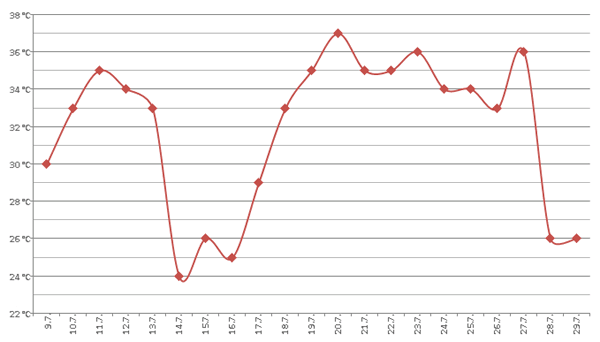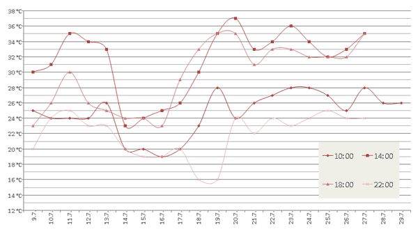 Měření teploty bylo prováděno během celého tábora sedmkrát denně. Nejzajímavější hodnoty naleznete v grafech, úplná data v následující tabulce.