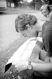 Středa 13.8. První dopoledne proběhlo až na únavu po akci normálně. Pracovalo se, ba i nějaká práce se udělala, i když se nad námi snášel Damoklův meč v podobě deště na spadnutí. Druhé dopoledne déšť skutečně spadl. Mužstvo bylo nalezlé v jídelně a studovalo staré učebnice o UFO, taky se trochu zpívalo. Odpoledne byl azimutový závod, rekordní počet lomení - 42. Rekord trati byl 30 minut posádka, 45 minut mužstvo. Vyskytly se v noci na středu dva případy morové infekce. Venca a Milan. Morová infekce ale dále pokračovala. Do morového pytle spadli postupně Kadajča, Pizi, Dušan. Nebylo dobře i posádce. Situace se stala vážnou, vzduchem lítaly kosy.