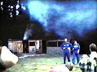 Čtvrtek 31.7. Celý den velké teplo, přímo tropické. Dopoledne vcelku normální pracovní. Po obědě jsem pro několik odvážných dobrovolníků z řad mužstva zorganizoval nácvik přechodu močálu. Dopadl úspěšně, ztráty žádné. Poté následovalo všeobecné mytí posádky a mužstva v rybníku. Tato koupel za tropického vedra očistila tělo a osvěžila ducha. Byla to dobrá příprava, protože ihned nato se všechny družiny vydaly hledat ztracené potravinové kontejnery. Pouze 2. a 4. družina stačily najít všechny tři kontejnery, takže přinesly nějaké jídlo - hlady zatím neumíráme. Ze tří kontejnerů přežil katapultáž bez úhony pouze jeden. Druhý kontejner byl porušený, obsah se někde vysypal, a třetí ohořelý. Asi okolo osmé hodiny večerní se strhla ukrutná bouře. Byla téměř tak silná jako ta při přistání, tedy vlastně katapultáži z krabice. Stromy nad táborem se hrozivě ohýbaly a hrozily polámáním a vyvrácením, takže tábor byl pohotový k evakuaci. Také silný déšť se spustil z oblohy. Tamira ukazovala svoji druhou tvář. Stan Máka a Mariana, jakási středověká vozová hradba, byl zatopený do výše dvaceti centimetrů. Spousty vod natekly i do hangáru a do jídelny. Do stanů mužstva a posádky pronikala voda jen ojediněle. Večeře se vydávala v dešti a jedla ve stanech. Na druhý den byl mnou posunut budíček na osmou hodinu.