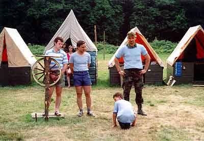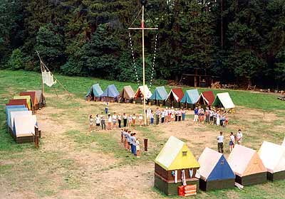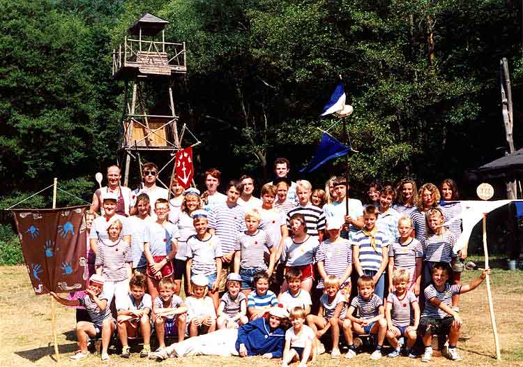Rok 1992 si o námět celotáborové hry řekl naprosto jednoznačně, protože uplynulo právě rovných 500 let od okamžiku, kdy Kryštof Kolumbus dorazil do Ameriky. Dnes už víme, že nebyl první, spekuluje se dokonce o tom, že on sám věděl, kam pluje, na základě starších dokumentů a svědectví. V žádném případě to však nesnižuje hodnotu tohoto úctyhodného výkonu. Atlantický oceán není žádný větší rybník. Ponechme teď stranou důsledky, které měly objevitelské cesty Kolumba a jeho následovníků pro domorodce. Celotáborová hra byla inspirovaná vlastní cestou přes oceán. Tábor byl postaven ve tvaru lodi, brána tvořila příď a byla vybavená sítí a lucernou, vlajkokláda se proměnila ve stěžeň (samozřejmě bez plachty) a na zádi, tedy před stany vedoucích, byl instalován kapitánský můstek s kormidelním kolem, odkud velitel vydával své rozkazy. Jednotlivé etapy probíhaly podle plánu, když jednoho dne se nejstarší táborníci Medvíďata dohodli, že na každé správné lodi musí dojít ke vzpouře. A tak jednoho rána si vzbouřenci přivstali, obsadili kuchyň a vyhlásili vzpouru. Marian a Šéďa, kteří se jim připletli do cesty, skončili po boji zavřeni v zásobáku (zajímavý druh hladomorny naruby). Zatímco ostatní vedení se radilo, jak dál, odháněl Pavel nechápavé plavčíky od kuchyně: "Jděte pryč, tady je vzpoura! Kšá, kšá!" Vzhledem k tomu, že vzbouřenci nenašli větší podporu mezi ostatním mužstvem (a ženstvem), došlo poměrně rychle k jejich přemožení. Soud byl krátký a vzbouřenci byli hozeni přes palubu. Protože se jim povedlo doplavat zpět k lodi, aniž by je sežrali žraloci, dostali milost a posádka pokračovala do Ameriky v plném počtu. |
