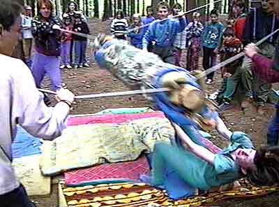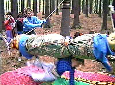 Léto roku 1996 bylo velice chladné. Snad i proto měl Ještěr značné problémy s rozděláváním ohně třením dřev. Po nějaké době to vzdal a pošeptal Lucii, že to nejde. Vedoucí se chvilku radili a pak Buggy prohlásil, že duch ohně je rušen a že se oheň bude muset rozdělat v klidu v teepee. To že okolo posvátného ohniště byl už delší dobu ruch, byla pravda, a tak toho Buggy využil. Zatím Ještěr v teepee chvíli třel dřeva o sebe a pak zapálil oheň třením sirky o škrtátko. Vynesl jej ven a zapálil připravenou hranici. Pak se snažila Ještěrka zapálit hořící větvičkou rudou dýmku nacpanou drtí z usušeného jahodového listí, jenže drť navlhla a dýmka jen párkrát začoudila, ale nechytla. Ještěrce nezbylo nic jiného, než s vyhaslou dýmkou provést rituál uctívání ducha rudé dýmky a pak dát dýmku ke kolování. Vzápětí dýmku Ještěr upustil a všichni vykřikli. To byl signál pro Starostu, který zapálil dýmovnici. Pak rozsvítil světlomety a na cestě k mostku se objevila temná postava. Zatím Kuba bojoval svoji soukromou bitvu. Zapnul první kazeťák, ale nic se neozvalo. Zastavil jej a zapnul druhý kazeťák se záložní nahrávkou. Ten naštěstí neselhal a duch promluvil.